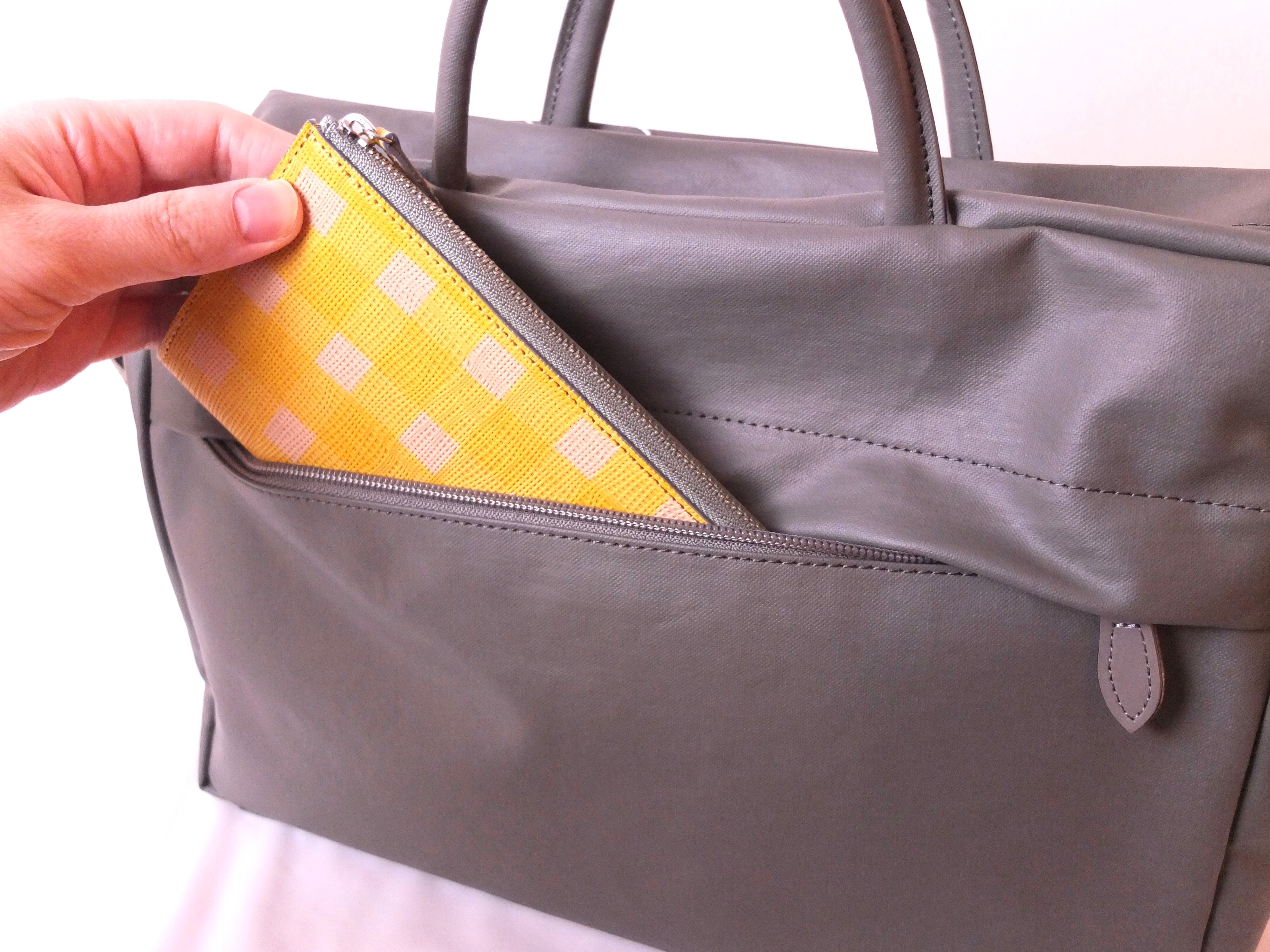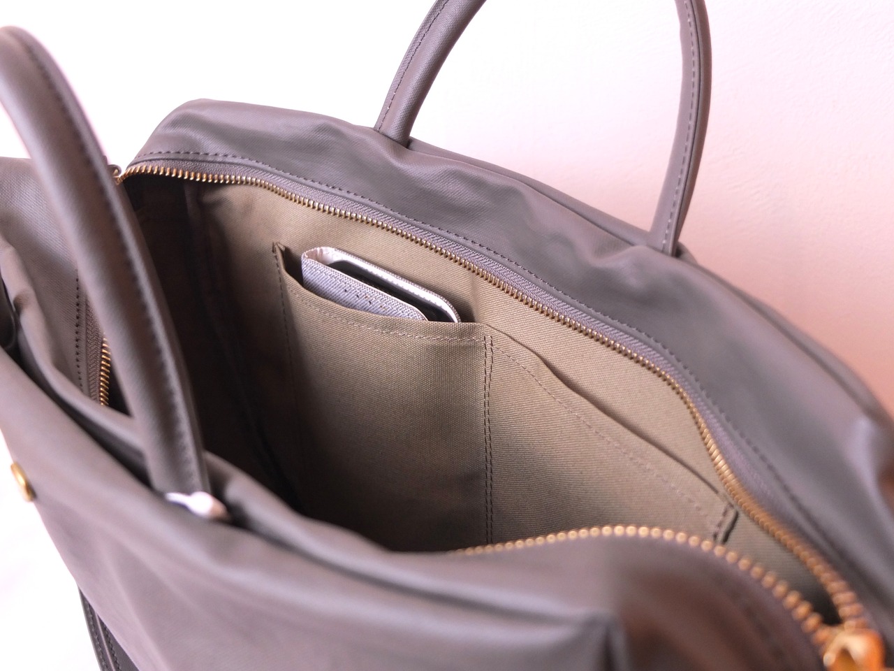比較的小さなサイズが多い2wayショルダーバッグの中で、A4まで入るやや大きめサイズ。マチも10cmあり、しっかりとした収納力が魅力です。口元にはホック付きのポケットがあり、スマートフォンの収納に便利です。背中側にはファスナーポケットが1カ所ございます。メインの開閉はファスナー。内側にはオープンポケットが2カ所、ファスナーポケットが1ヶ所ございます。